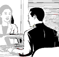 the pc and waits for his answer.